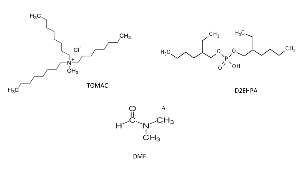Molecular structure of Trioctylmethylammonium chloride (TOMACl), bis (2- ethylhexyl) phosphate (D2EHPA) and Dimethylformamide (DMF).