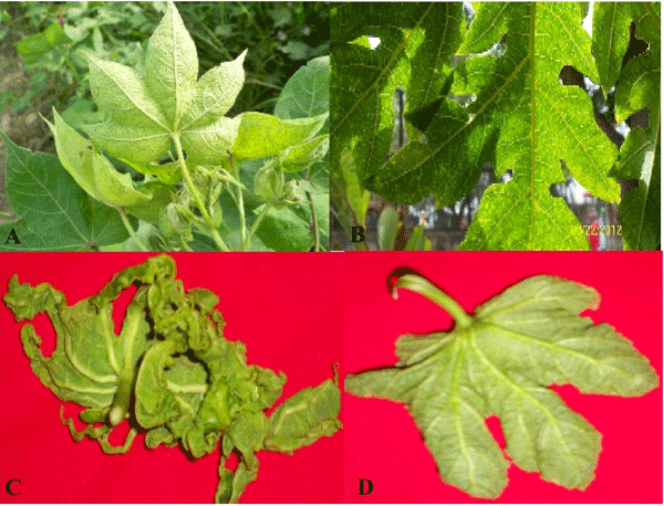 | Figure 1: Figure showing Gemini virus infection in different plants. A: Leaves of cotton; B and C: leaves of papaya; D: Single leaf of okra. All the leaves are showing characteristic geminivirus symptoms such as leaf curling, vein thickening, mosaics etc. |