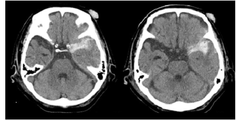 CT performed 4 days after head injury revealed massive subarachnoid hemorrhage in the left sylvian fissure; CT, computed tomography.
