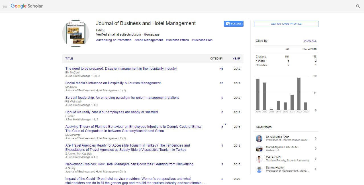 Journal of Business & Hotel Management is a subscription based journal that provides a range of options to purchase our articles and also permits unlimited Internet Access to complete Journal content. It accepts research, review papers, online letters to the editors & brief comments on previously published articles or other relevant findings in SciTechnol. Articles submitted by authors are evaluated by a group of peer review experts in the field and ensures that the published articles are of high quality, reflect solid scholarship in their fields, and that the information they contain is accurate and reliable.