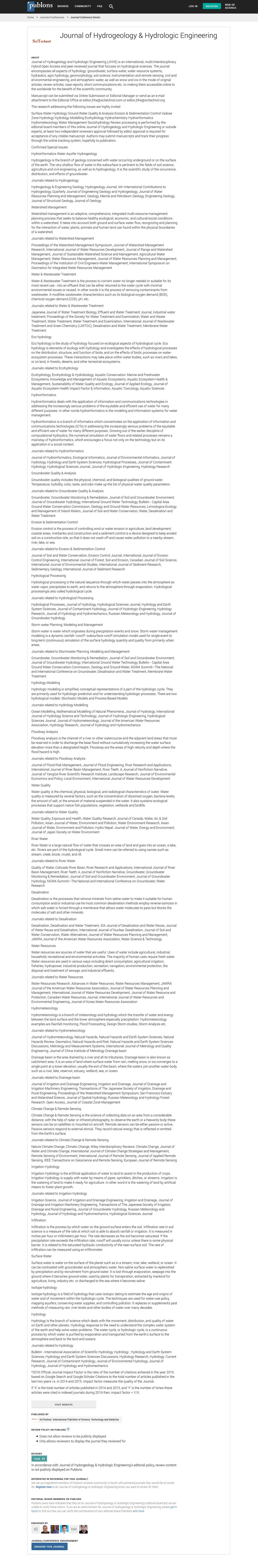 Journal of Hydrogeology and Hydrologic Engineering (JHHE) is an international, multi/interdisciplinary Hybrid Open Access and peer-reviewed journal that focuses on hydrological sciences. The journal encompasses all aspects of hydrology: groundwater, surface water, water resource systems, hydraulics, agro hydrology, geomorphology, soil science, instrumentation and remote sensing, civil and environmental engineering, atmospheric water, snow and ice in the mode of original articles, review articles, case reports, short communications etc. To making them accessible online for the benefit of the scientific community Globally.