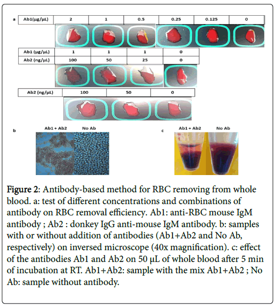 Figure 2: Antibody-based method for RBC removing from whole blood. a: test of different concentrations and combinations of antibody on RBC removal efficiency. Ab1: anti-RBC mouse IgM antibody ; Ab2 : donkey IgG anti-mouse IgM antibody. b: samples with or without addition of antibodies (Ab1+Ab2 and No Ab, respectively) on inversed microscope (40x magnification). c: effect of the antibodies Ab1 and Ab2 on 50 μL of whole blood after 5 min of incubation at RT. Ab1+Ab2: sample with the mix Ab1+Ab2 ; No Ab: sample without antibody.