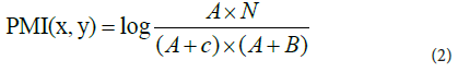 Given the estimation that (x, y) = A/ , p(x) = A+B/ N and p(y) = A+C/N, where N is the size of the dataset, the PMI can be estimated as follows: