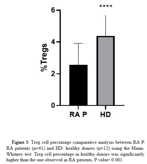 Chronic autoimmune disorders, including Rheumatoid Arthritis (RA), are characterized by a disturbed balance between effector and regulatory immune responses [1]. In RA, an extended inflammatory reaction leads to severe tissue damage and further physical function disability [2]. Here is the importance of enhancing autologous immunosuppressive mechanisms to promote immune homeostasis. In this regard, several authors remark on the key role of Treg cells in autoimmune disease outcomes [3]. This cell population is well known for modulating the immune system by repressing an exacerbated inflammatory response toward self-antigens [4]. Previous data report the bad prognosis in Collagen Induced Arthritis (CIA) mouse model disease course, in a context of tregs deprivation. In this model, a reduction in the proportion of Tregs following treatment with anti- CD25 antibody aggravated arthritis, whilst injection of Tregs had a contrary effect [5]. Additionally, Avdeeva, et al. reported that responsiveness to therapy with Methotrexate (MT), the “gold standard” of RA pharmacotherapy was related to augmentation of Treg population in patients with early onset, suggesting treg as a decisive biomarker for determination of treatment effectiveness in disease resolution [6]. Therefore, given the role of Tregs in autoimmunity, monitoring this subset of T lymphocytes in therapeutics trials could be a promising tool in predicting the course of RA treatment.
