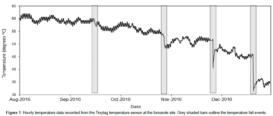 Hourly temperature time series data were derived from a Tinytag temperature sensor which has been installed at the surface of a fumarole site, buried approximately 20 cm under the surface of the volcano. The temperature data on the volcano have been measured from August 2016- January 2017 and 3571 records of hourly temperature data are plotted in Figure 1.