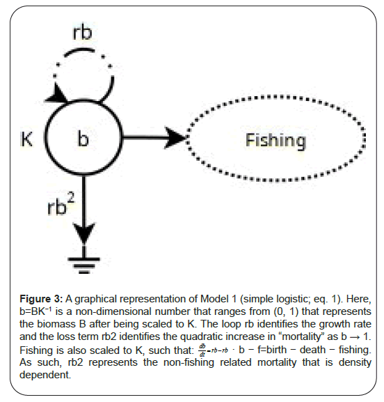 From the graphical representation of the processes of Model 1 (Figure 4), one can immediately see that there is no input term from outside of the system: it is a simple phenomenological self- loop model with two outputs (death and fishing). The term rb can be referred to as the (net) “birth process” [36-38], and represents a first order processes that increases b (via birth, growth, enhanced survival, improved food availability, movement, strong year class strength, etc.), through the single (static) parameter r. The mechanism is not identified and is implied to be some internal recycling of b. In reality, there are biological mechanisms involved and associated parameters that are not-static and non-stationary (in first and second order; across time and space). Growth in biomass or increase in numbers is seasonal and pulsed, due to the molting process and body mass increases, that progress at variable rates depending upon time of year and environmental variability. Across years, there are strong and weak year classes due to match-mismatch type processes and so also pulsed [39,40]. These simple models cannot address these more realistic dynamics and so we obtain instead, an average state, with poor resolution of peaks and troughs and associated parameter estimates that are likely to be in error.