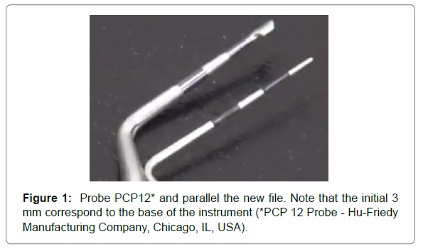 Periodontal instruments should be introduced in subgingivally pockets, from the gingival margin to the bone crest. The difficult lies in stablishing an analogy of this depth measurement to the probe by a PCP 12 and the corresponding input of this files at the same distance. These new files, similar to Hirschfeld, have been modified with external marking at 12 mm, allowing the Periodontist this analogy, and facilitating the root scaling process (Figures 1 and 2).
