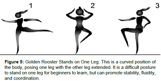 Golden Rooster Stands On One Leg: This is a curved position of the body, posing one leg with the other leg extended. It is a difficult posture to stand on one leg for beginners to learn, but can promote stability, fluidity, and coordination (Figure 5).