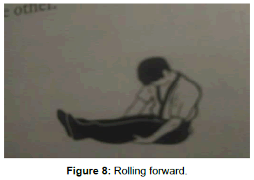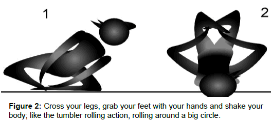 Rolling: (1) Put your feet together, embrace your hands, and shake back and forth (Figure 1). (2) Cross your legs, grab your feet with your hands and shake your body; like the tumbler rolling action, rolling around a big circle (Figure 2).