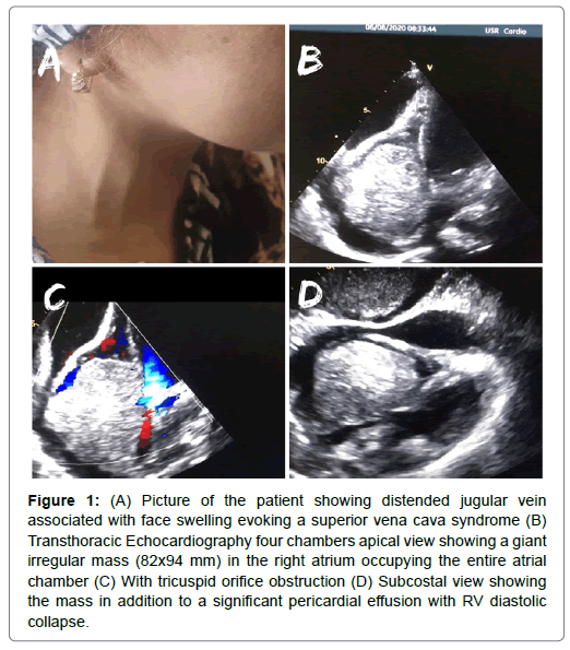 Figure 1: (A) Picture of the patient showing distended jugular vein associated with face swelling evoking a superior vena cava syndrome (B) Transthoracic Echocardiography four chambers apical view showing a giant irregular mass (82x94 mm) in the right atrium occupying the entire atrial chamber (C) With tricuspid orifice obstruction (D) Subcostal view showing the mass in addition to a significant pericardial effusion with RV diastolic collapse.