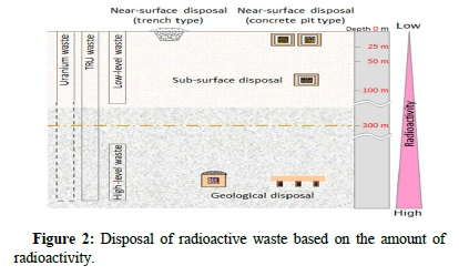 The subsequent subsections will discuss the many conventional and cutting edge techniques for disposing of radioactive waste. It will discuss which sorts of radioactive nuclear waste are suitable for each approach and the accompanying benefits and drawbacks. The installation of waste packages in rock tunnels and filling the space left by the destruction with compacted betonies clay constitute one possible design for disposing of spent nuclear fuel and waste. The waste packages would provide heat for the bentonite backfill, while the host rock would provide moisture. Each notion's feasibility and limitations will also be examined as they pertain to abstract techniques for disposing nuclear waste. According to the radiation level, radioactive waste disposal is depicted in Figure 2 and various disposal methods of radioactive nuclear waste will be discussed in the subsequent paragraphs.