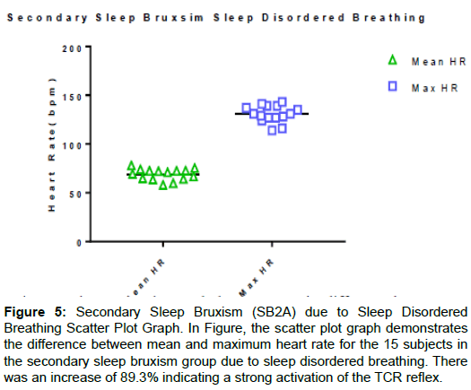 Figure 5: Secondary Sleep Bruxism (SB2A) due to Sleep Disordered Breathing Scatter Plot Graph. In Figure, the scatter plot graph demonstrates the difference between mean and maximum heart rate for the 15 subjects in the secondary sleep bruxism group due to sleep disordered breathing. There was an increase of 89.3% indicating a strong activation of the TCR reflex.