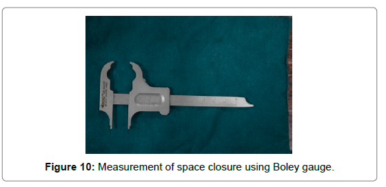 The distance between the cusp tip of the mandibular cuspids and the buccal cusp tip of mandibular second bi-cuspids was measured using a Boley gauge (GDC, 4982) on every appointment (Figure 10). A force of 150 gm was delivered and was measured with the help of Dontrix force gauge (Dynamometer, 42-FGD-352, Nexadental). Retraction assemblies were re-activated on every visit to keep the force values constant.
