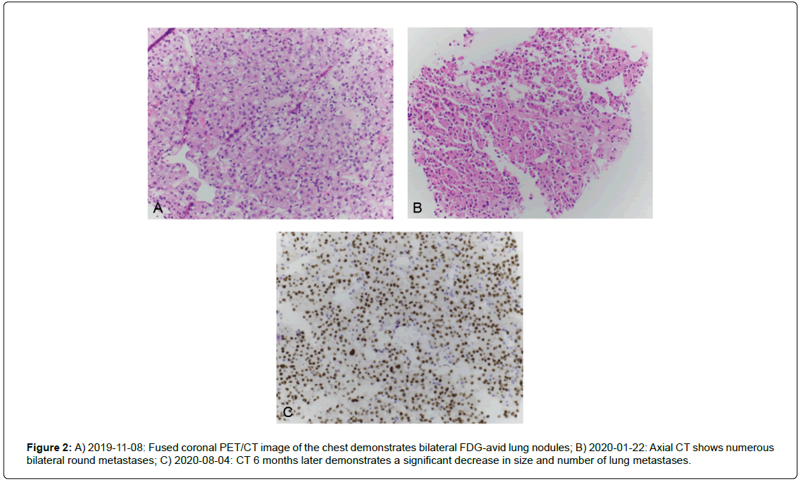 Figure 2: A) 2019-11-08: Fused coronal PET/CT image of the chest demonstrates bilateral FDG-avid lung nodules; B) 2020-01-22: Axial CT shows numerous bilateral round metastases; C) 2020-08-04: CT 6 months later demonstrates a significant decrease in size and number of lung metastases.