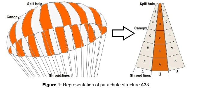 Stratospheric parachute studied is called A38. This parachute is hemispherical, commissioned in 1968 and used for flights up to 38 km altitude. The parachute canopy is formed of 18 spindles zones, 9 ecru and 9 orange. Each zone is composed of 5 panels rated from A to E, where E is the closest panel to the spill hole (Figure 1).