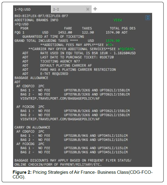 (Figure 2) elucidates pricing strategies of Air France, a round tripbusiness class (Paris-Roma -Paris). It turns out from the figure that the total fare of the ticket on-board of Air France (CDG-FCO-CDG)is 1574.90 USDollars (USD). The free pieces ofbaggage allowancearetwo pieces of baggage per business class passenger;the weight of one piece should not exceed 32KG per business class passenger.It is also remarkable from the figure that thepieces of carry-on baggage permitted are 2PCs of cabin baggage per business class passenger will be carried in the cargo compartment free of charge; the weight of one piece should not exceed9KG.