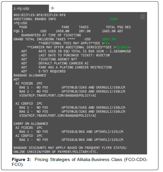 (Figure 3) clarifies pricing strategies of Alitalia, a round tripbusiness class (Roma-Paris -Roma). According to Figure 3, the total fare of the ticket on-board of Alitalia (FCO-CDG-FCO) is 1665.90 US Dollars (USD). The free pieces of baggage allowance are two pieces of baggage per business class passenger; the weight of one piece should not exceed 32KG per business class passenger. It is also remarkable from the figure that the pieces of carry-on baggage permitted is 1PC of cabin baggage per business class passenger will be carried in the cargo compartment free of charge; the weight of one piece should not exceed 8KG.
