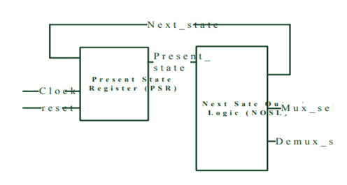 The complete datapath block is shown in the above Figure 2. The FSM logic having the mux and demux (sel input) for the datapath block. The present state logic having the register and the next state logic having the combinational block (adder circuit).