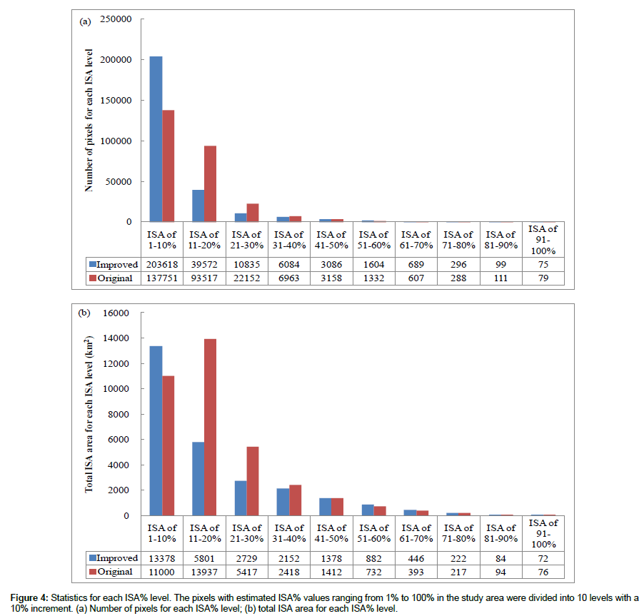 By comparing the results from the improved Pok17 method with those from the original Pok17 method, it can be seen that the biggest contributor of ISA area was the first ISA% level (i.e., ISA% of 1-10%) in the former method but the second ISA % level (i.e., ISA% of 11%-20%) in the latter method. In total, the improved Pok17 method estimated an ISA area of 27,144 km2 in the study area, while the original Pok17 method estimated a larger area of 35,696 km2 (about 1.3 times). The pixels with ISA % values less than 20% contributed 67.3% of the total reduction.
