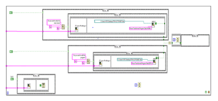 Program: LabVIEW follows a dataflow model for running VIs. When a node completes execution, it supplies data to its output terminals and passes the output data to the next node in the dataflow path. For this application we are making use of case structures. Case Structure has one or more sub diagrams, or cases, exactly one of which executes when the structure executes. The value wired to the selector terminal determines which case to execute and can be Boolean, string, integer, or enumerated type. Right-clicking the structure border to add or delete cases. The Labeling tool can be used to enter value(s) in the case selector label and configure the value(s) handled by each case. The testing panel is programmed using LabVIEW software. This program is loaded on to the destination PC where the testing process takes place. The reason being, data acquisition becomes easier with LabVIEW when compared to other programming platforms. The test panel contains several Sub VIs. A few of them are shown in Figures 5,6 and 7.