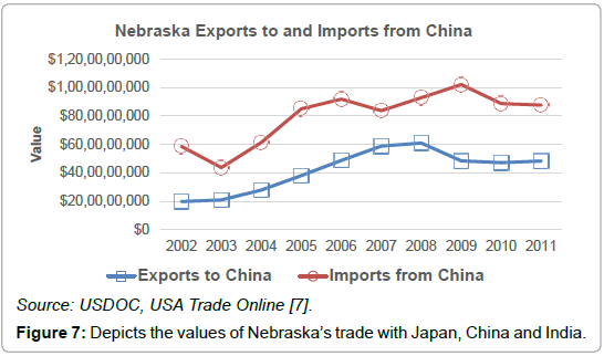The Figures 5-7 below depicts the values of Nebraska’s trade with Japan, China, and India.