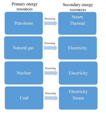 Primary as well as secondary drive resources: Primary energy resources are the natural energy resources that are stored in the nature in the form of raw materials. Some of the most common primary energy sources are coal and fossil fuels. This class of the energy resources can be directly used in different sectors such as transportation. The primary energy resources can be utilizing in order to convert primary energy resources to another energy resource such as electricity and steam. The energy resources which are generated from the primary energy resources are generally refers to the secondary energy resources. Among the all secondary energy resource, electricity is the generated and consume at greater scale. The utilization of the electricity reduces the pollution significantly as compared to the primary energy resources because it doesn’t produce any kind of pollution. For example, electric vehicles produce negligible air pollution as compared to the vehicles running on petrol and diesel that is why electric vehicle demand is increasing day by day. Figure 2 illustrates the primary and their respective secondary energy resources.