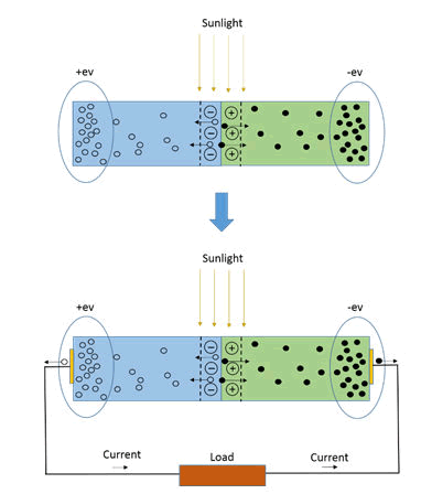 After breaking the covalent bonds inside the depletion layer, large number of the electron-hole pairs is generated. These charge carriers accelerated through the ions present in the depletion layer [10]. In the case of electrons, the acceptor ion applies a repulsive force on the electrons due to which electrons migrates to the n-type region. These photo generated electrons are accumulated at the end of the n-type region. In the case of the holes, donor ions apply a repulsive force to the holes due to which the holes migrate to the p-type region and accumulated at the end of the p-type region. Due to the accumulation of the charge carriers (i.e., electrons in n-type and holes in p-type), a charge is created at the end. At the p-side, positive charge is created and at the n-side, negative charge is created. Overall, a potential difference is created between the both ends of the device. Now, when a load is connected across the device, due to the potential difference, a current is flow through the load. The voltage generated by the single solar cell is very low, that is why multiple solar cells are connected in series in order to generate the high voltage.