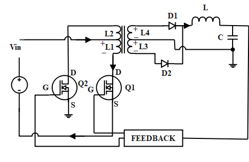 A push-pull converter is a converter that continuously pushes currents through it and pulls currents from something. Using this push-pull mechanism, the transformer transmits flux to the secondary coil and creates some kind of isolated voltage [52]. The transformer is turned on, then the current is pushed and released concurrently because this is a switching regulator. A push-pull converter is used as a transformer to adjust the voltage levels. During the asymmetrical push-pull circuit, a pairs of transistors supply current to the transformer from the input line, as shown in Fig 13.