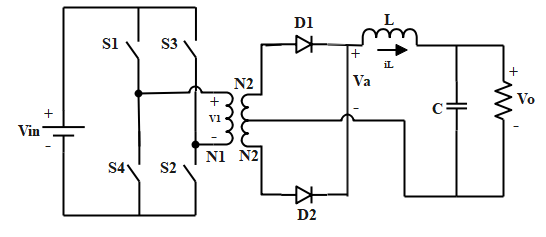 The converter is used to increase or decrease the voltage levels with the help of transformer and it provides galvanic isolation for the load. Multiple output windings are used to produce both greater and lower voltage. The load is connected to the secondary winding of the transformer is used to rectify the output. The output voltage of the transformer is connected across the LC filter and load [51]. The current in the transformer is reduced to zero when the switch is in off position.