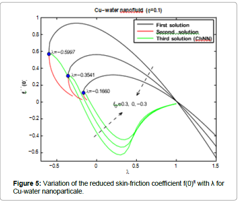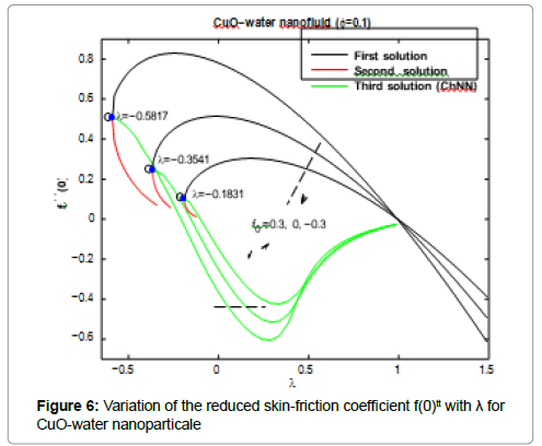 Figures 9 and 10 show the variation of −gt(0) with λ for Ag and Al2O3-water nanofluid and different values of f0 when Nt=0.1, Nb=0.3, Le=1, Pr=0.1 and φ=0.1. By using the fifth order Runge- Kutta method with shooting technique can find dual solution for −gt(0). The Chebyshev neural network can give third solutions for -gt(0) which is couple with first solution as showed in Figures 9 and Figure 10. It is seen that the solution is dual when λ ≥ 0, while trinal solutions are found to exist when λ ≤ 0. The values of −gt(0) are positive for all values of λ, for all values of the suction/injection parameter f0.