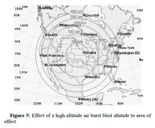 The use of a high-altitude nuclear blast for the purpose of using of its electromagnetic effect is a way to produce a high-powered pulse to destroy the infrastructure of a country, from the radar and radio systems to the unprotected civilian and military infrastructure. Let's put it this way, all systems will go down in a wide geographic Area based on the altitude and yield of the blast unprotected systems and infrastructure will be destroyed; bridges and pipelines will act as propagating antennas (Figure 5). Communications will not be possible due to the ionization effect of the charged particles for a considerable amount of time in military, communication is the key, even a couple of hours without communication can be considered a major disturbance When we are talking about the altitude, we are talking 200 km and above within to above the ionosphere so the risk of the nuclear fallout is minimum, remember the worst fallout belongs to the ground burst blasts as the famous mushroom cloud sucks away the dirt and mix it with the product of the nuclear fission then scattering it across a large area and when that happens it spreads with the wind and rain [8]. So, airbursts are the safest in terms of fallout.