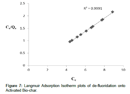 Where Qe denotes amount of fluoride adsorbed at equilibrium (mg/L), Ce denotes concentration of fluoride in the aqueous phase at equilibrium (mg/L). KL and qm denotes Langmuir constants related to energy of adsorption and the adsorption capacity.