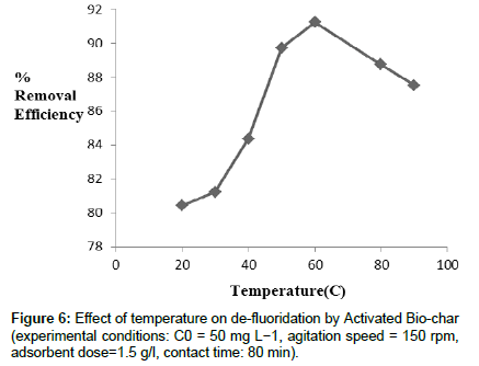 Effect of temperature: In the above experiment, it is represented that with increasing temperature, the removal efficiency of fluoride increases sharply at 333K then it decreases. Following the adsorption process, 333 K is the feasible condition for batch de-fluoridation (Figure 6). Above 333K the de-fluoridation efficiency decreases. With increasing temperature, the attractive force between adsorbent and fluoride ions increases, resulting adsorption capacity of activated biochar increases. So the residual amount of fluoride ions decreases in the solution. Above 333 K, the amount of residual fluoride increases slowly. In (Figure 6) this phenomenon is reflected properly.