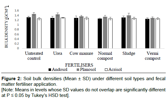Bulk density: In bulk density the effect of fertiliser application, interaction between fertiliser and soil types, trial and block were not significantly different, but the soil types alone as independent variable had significant difference at P ≤ 0.05. Planosol had high bulk density followed by Andosol and Acrisol respectively although there was no significant difference between Andosol and Acrisol (Figure 2).