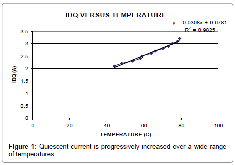 LDMOS semiconductors are currently used by almost all commercial RF amplifiers today [1,2] but can also be applied in applications such as therapeutic ultrasounds and in other medical equipment. The reason is because LDMOS provide high gain, high power output and very good operating reliability [3]. As a result, a single LDMOS device eliminates complex circuits that consist of many switching FET’s as in traditional amplifiers manufactured for the High Frequency bands (HF). As far as the above mentioned parameters are concerned, they are considered very important for the specifications and the long run reliability of a signal amplifier and must be kept constant under any operating conditions [4]. For example, an important parameter that can affect the above is the temperature that develops on the LDMOS case and spreads on the heat sink where the effects are listed below. The quiescent current is a very important factor that determines the final performance of an LDMOS amplifier [5]. It has been justified experimentally that the quiescent current is progressively increased depending on the temperature of the semiconductor even when the amplifier is not driven [6]. It occurs when it exceeds 0.7A as shown in Figure 1. The temperature versus IDQ is also expressed by Eq.1.