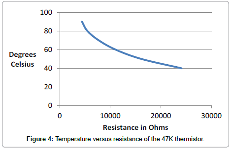 The change of temperature on the LDMOS’s die relative to the resistance of the thermistor is also given by Figure 4 where equations 3 and 4 have been derived as they are given below: