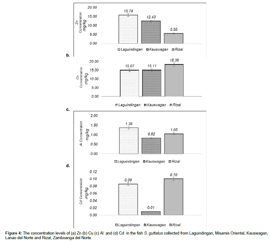 Al and Zn were both detected to have the highest concentration among the 4 elements. The order of concentration of the metals in the samples is: Al>Zn>Cu>Cd. Highest Al concentration was found in S. guttatus samples from Rizal with mean concentration value of 18.360 mg/kg. Zn was also detected high in the fish samples with highest level detected from Laguindingan with mean value 15.783 mg/kg. Zn is considered a micronutrient essential for the growth and development of plants and animals [21], and it also acts as limiting nutrient in the marine environment [22,23]. For Cu and Cd concentration, highest mean value were detected in fish samples from Laguindingan and Rizal at 1.046 mg/kg and 0.100 mg/kg respectively. These two metals are potentially hazardous at high concentration and could be possibly fatal to humans at high dosage (Figure 4).