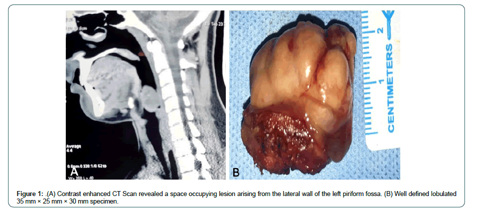 Synovial sarcoma is usually seen near large joints and bursae originating from the primitive pluripotent mesenchymal cells [1]. Therefore, the extremities are the common site of occurrence followed by the head and neck region (5% to 10% of all cases) [2,3]. Most of the cases in the head and neck region originate in the paravertebral connective tissue spaces and present as retropharyngeal and/or parapharyngeal masses [4]. Since the first case report of a hypopharyngeal synovial sarcoma by Jernstorm, there have been independent case reports [5]. Pathologically synovial sarcoma has two main components, spindle cells (fibrous) and epithelial cells. If spindle cells are predominant on histopathology, it is categorised as monophasic synovial sarcoma. Biphasic subtype is composed of both spindle and epithelial components and a poorly differentiated synovial sarcoma has also been reported [3,6]. Due to the rare nature of this neoplasm, their diagnosis and therapy is a challenge. No male preponderance has been reported in synovial sarcoma of the head and neck, contrary to that of extremities, where male to female ratio is 1.2:1.3. Very less number of cases have been reported in the subsites like pyriform fossa [4]. We present a case of biphasic synovial sarcoma of the left lateral wall of the pyriform and discuss the surgical approach, pathology with an update on management.