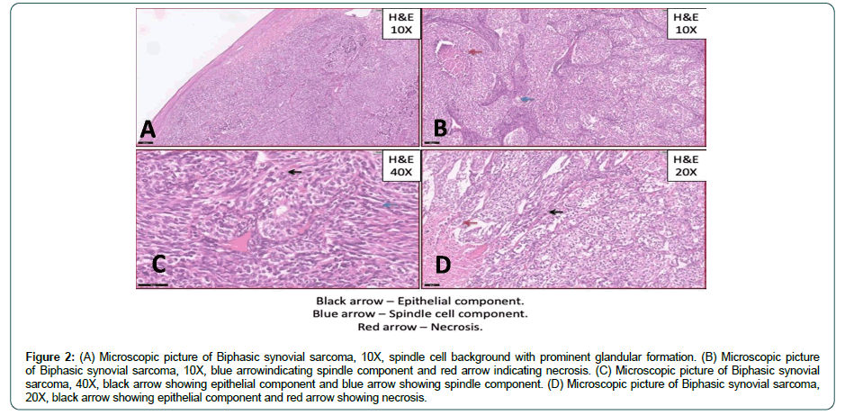 Histopathology is characterised by presence of spindle and epithelioid cells (Figure 2A and B). Epithelial component consists of cuboidal or tall columnar cells that form nests or glandular structures (Figure 2C and D, black arrow) and the spindle cells are densely packed in fascicles or sheets form the sarcomatous component (Figure 2B, blue arrow). Immunohistochemistry plays a crucial role for definitive diagnosis. TLE1, in view of its high sensitivity is a useful marker within the IHC panel comprising EMA, BCL2, MIC2, CD34 and CK7, especially on small biopsy samples, for substantiating a diagnosis of synovial sarcoma [9]. Pathogenesis of the synovial sarcoma has been explained on genetic basis, a reciprocal translocation between chromosome 18 and Xt (X;18) (p11.2;q11.2) generates the SYT-SSX1 or SYT-SSX2 gene usion [10,11]. This gene fusion appears to be the primary event in the pathogenesis of synovial sarcoma and can be observed in far more than 90% of patients [11,12].