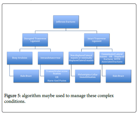 Complex C1C2 fractures require unique consideration. The accompanying calculation possibly used to deal with these unpredictable conditions. The favored kind of medical procedure is reliant upon the intricacy present and additionally the nearness or nonappearance of transverse tendon burst (Figure 5) [4].