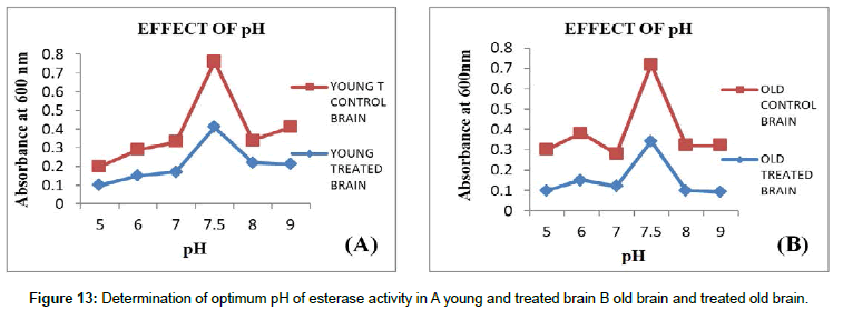 pH: Effect of different buffers with different pH on carboxyl esterase’s was carried out in the range of pH-5-9 in which optimum pH 7.5 showed maximum CE activity. During the assay, the pH is brought back to optimum to detect the maximum activity (Figures 13 and 14).
