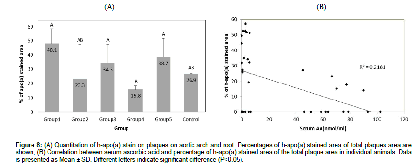 Figure 8: (A) Quantitation of h-apo(a) stain on plaques on aortic arch and root. Percentages of h-apo(a) stained area of total plaques area are shown; (B) Correlation between serum ascorbic acid and percentage of h-apo(a) stained area of the total plaque area in individual animals. Data is presented as Mean ± SD. Different letters indicate significant difference (P<0.05).