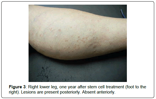 One-week postoperatively, she noticed that her skin lesions had markedly improved. By four weeks, all skin lesions had disappeared completely, although she still had mild left knee pain. Skin lesions were absent completely for seven months postoperatively. After this period of time, they began to return on the thorax and extremities (Figure 2). She did receive two additional interarticular injections into the left knee with “some improvement” in her discomfort, but did not receive any additional systemic intravenous therapy (other than the single treatment at the time of cell harvest). When the skin lesions returned, they were not as severe as her usual outbreaks that occurred prior to stem cell treatment. After one year, they were limited to clusters on the lower extremities, elbows and thorax (Figure 3).