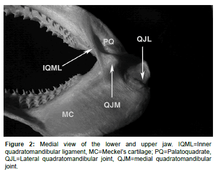 The stability of the PQ and the MC is established through an array of ligaments and tendons with their associated muscles, as well as the hyomandibula and ceratohyale [20]. Blacktip sharks possess the typical hyostyle jaw mechanism of modern elasmobranchs with QJL and QLM forming a dual articulation (Figure 2). This joint orientation resists lateral movement [20]; therefore hook ripping with a force perpendicular to the ligaments’ support system of the joint could cause a dislocation [4], leaving a clear gap between the two jaws in the corner of the mouth (Figure 1). One of the main ligaments affected is the inner quadratomandibular ligament (IQML). Depending on the force with which a hook is pulled, other ligaments in addition to the IQML could get torn or ripped from their entheses as well [20]. Losing the stability of those ligaments could be the reason why the MCs of the more severe injuries looked as if they were rotated outward. This effect could be intensified by a still intact ventral coracomandibularis muscle [25].
