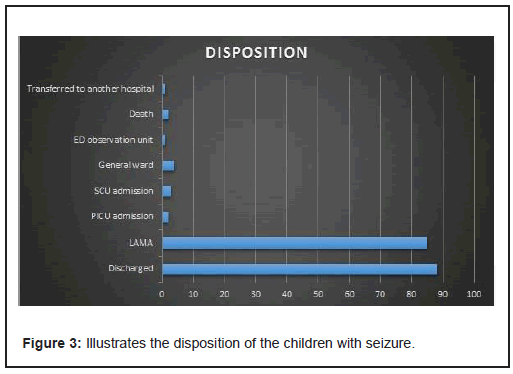 Conclusion: Seizure was one of the commonest neurological condition occurring predominantly in males. Febrile seizures usually donot require hospitalization. Emergency Department care was needed in majority of children and 45.7% were discharged directly from Emergency Room.