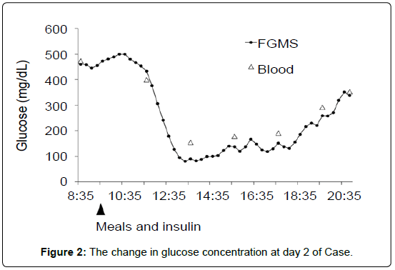Black circle and solid line indicate interstitial fluid glucose concentration measured by FGMS and white triangles indicate blood glucose concentration. The timing of meals and insulin is indicated by black triangles under the graph. From the results of FGMS, it can be seen that the glucose concentration increased once after eating and then decreased.