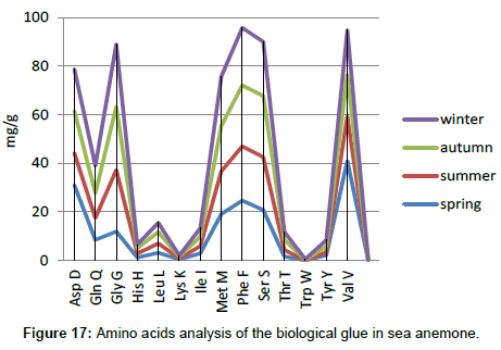 Dry samples of the basal discs or attachment integuments of the five species in winter showed that the indispensable and conditional amino acids predominated in tissues are especially Aspartic acid (Asp D), Glutamine (Gln Q), Glutamic acid (Glu E), Glycine (Gly G), Methionine (Met M), Phenylalanine (Phe F), Serine (Ser S), Threonine (Thr T), Tryptophan (Trp W) and Valine (Val V). Aspartic acid (Asp D) ranged from 8 ± 3 to 22 ± 6 % of the total dry weight of tissues; Gln Q ranged from 13 ± 4 to 14 ± 9 % of the total dry weight of tissues; Glutamic acid (Glu E) ranged from 4 ± 3 to 17 ± 2 % of the total dry weight of tissues; Gly G ranged from 12 ± 1 to 15 ± 1% of the total dry weight of tissues; Met M ranged from 12 ± 4 to 14 ± 8 % of the total dry weight of tissues; Phe F ranged from 11 ± 6 to 15 ± 1% of the total dry weight of tissues; Ser S ranged from 9 ± 6 to 13 ± 1% of the total dry weight of tissues; Thr T ranged from 12 ± 3 to 13 ± 9% of the total dry weight of tissues; Trp W ranged from 12 ± 9 to 14 ± 1 % of the total dry weight of tissues and Val V ranged from 12 ± 4 to 16 ± 1% of the total dry weight of tissues (Table 2, Figure 6-10).