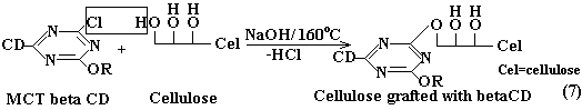 | The data presented in Table 1 confirm together with the FTIRATR spectra MCT-β-CD presence on the cellulose. Having the certainty that CD derivative is grafted on the textile material, we consider that between cotton cellulose and the triazine derivative a nucleophilic substitution reaction takes place, as illustrated in Equation 7. | |