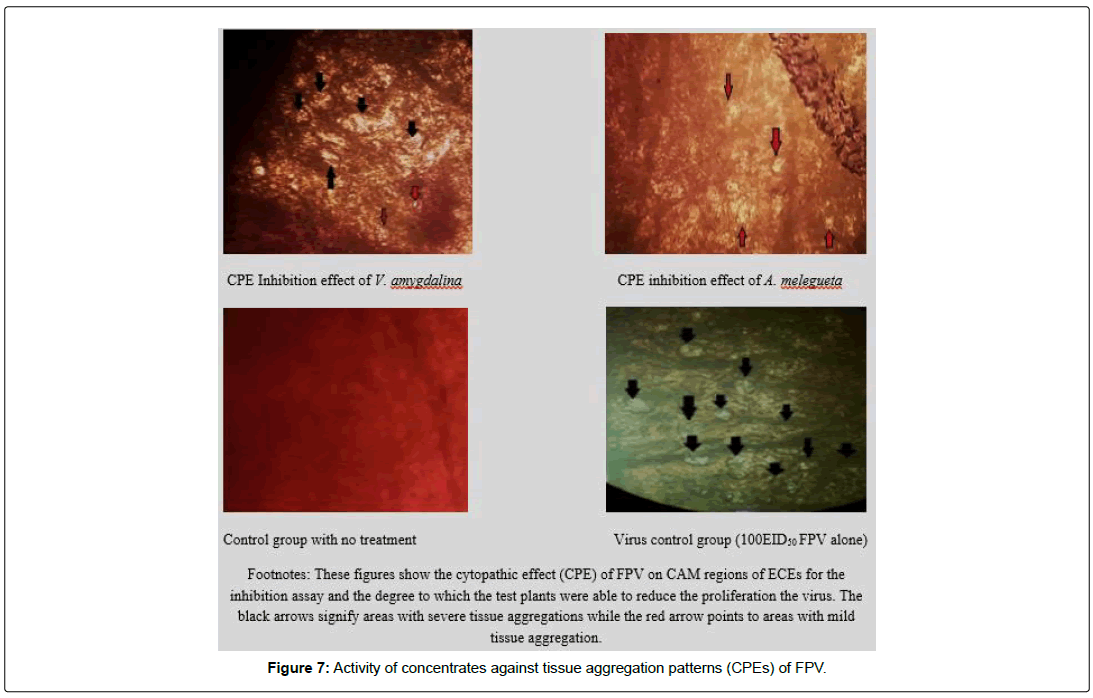 This current study has shown that the concentrates from V. amygdalina and A. melegueta showed strong inhibition potential against proliferation and propagation of FPV in ECE. This study also points to the need for further studies on the compounds characterized in the concentrates to deliver them effectively as antiviral targets for better inhibition of FPV in living tissues. Furthermore, from this study, we recommend the consumption of supplements from the plants V. amygdalina and A. melegueta for respondents already showing overt symptoms of poxvirus infection.