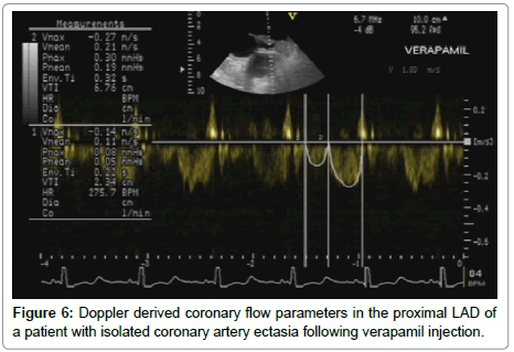 Pulsed Wave (PW) sample volume was placed over the proximal portion of the LAD, and the direction of the sample volume was made as parallel as possible to that of the LAD, followed by spectral recording of the flow velocity, with assessment of the following parameters: Peak systolic and diastolic velocities (m/sec); Systolic, diastolic, and total velocity time integrals (VTI) (cm). The coronary blood flow parameters (systolic, diastolic and total) were calculated using the following formula: Coronary flow (cm/min)=Coronary cross section area X Velocity time integral X heart rate. Following Intravenous injection of verapamil bolus in a dose of 0.1 mg/kg, heart rate, blood pressure and all the previously mentioned measurements were reassessed within 5 minutes of verapamil administration (Figures 1-6).